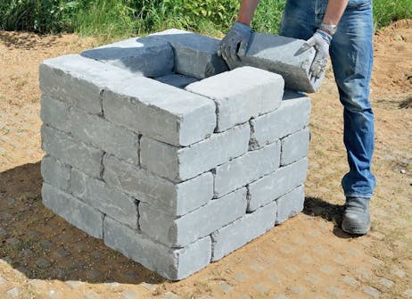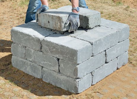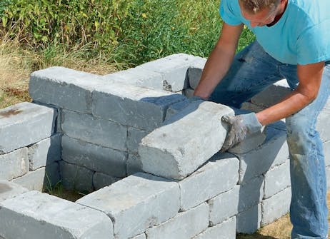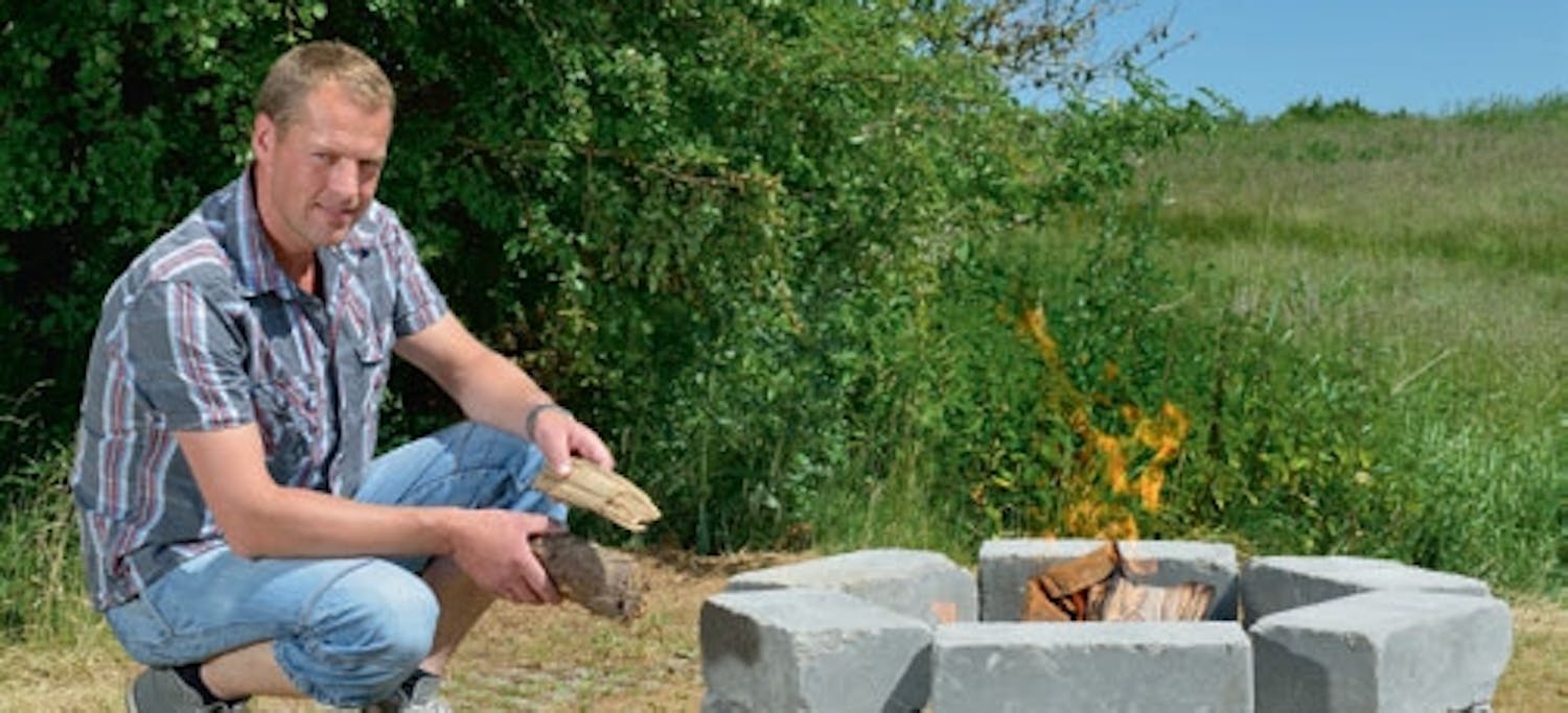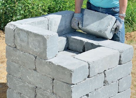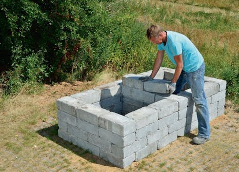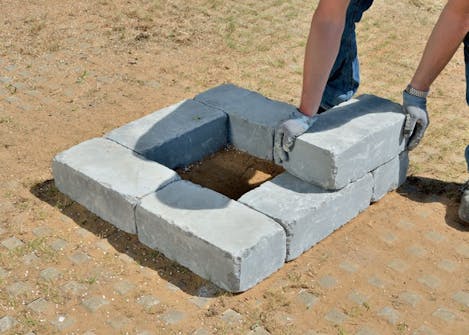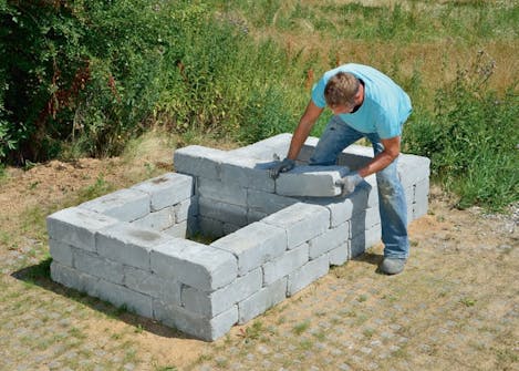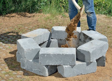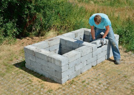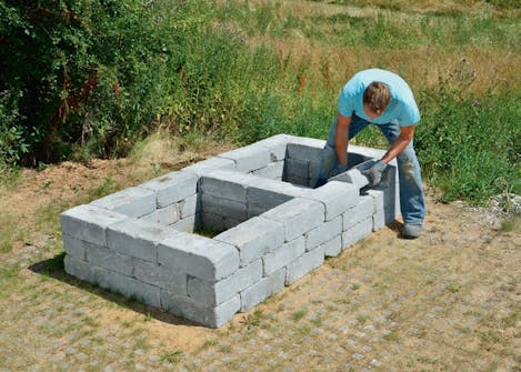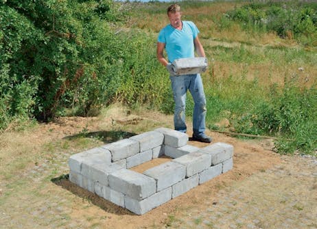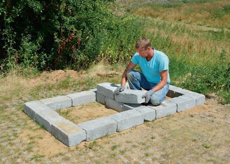 Eldstaden byggs upp cirkelrund och består av två skift med block som ska läggas förskjutna eftersom de då håller varandra på plats. Den låga konstruktionen ställer inga krav på underlaget men skyffla gärna ut lite sand på marken innan du bygger.
