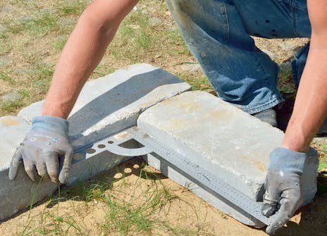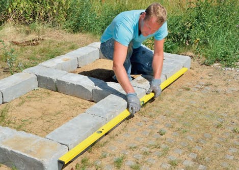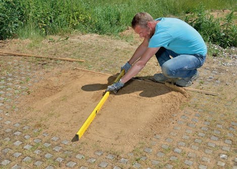 Skyffla ut lite sand på marken och jämna till ytan med en rät bräda eller ett vattenpass så att sandbädden blir plan och vågrät.