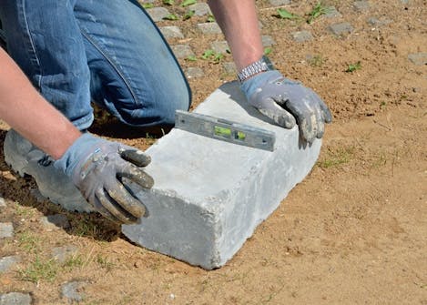 Skapa en plan sandbädd och lägg de första blocken med 2-5 mm avstånd så att ojämnheter i blocken elimineras. Kolla att de ligger vågrätt åt bägge hållen.