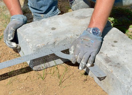 Kolla fortlöpande att blocken ligger på samma nivå och att utsidan blir plan. Eftersom denna konstruktion är rätt stor är det viktigt att vara noggrann.