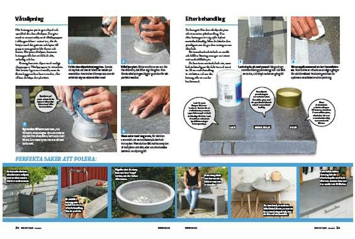 MATERIAL SMART KEMISK METALL Det kommer alltid att bli hål i betongytan. Det är svårt att fylla igen dem med en cementbaserad produkt, och härdtiden är lång. Istället är det lätt att spackla med tvåkomponentsspackelmassan “kemisk metall”, som lämpar sig mycket väl. Den passar i färg, är lätt att spackla ned i hålen, härdar på bara några minuter och gör det lätt att slipa ytan helt slät.