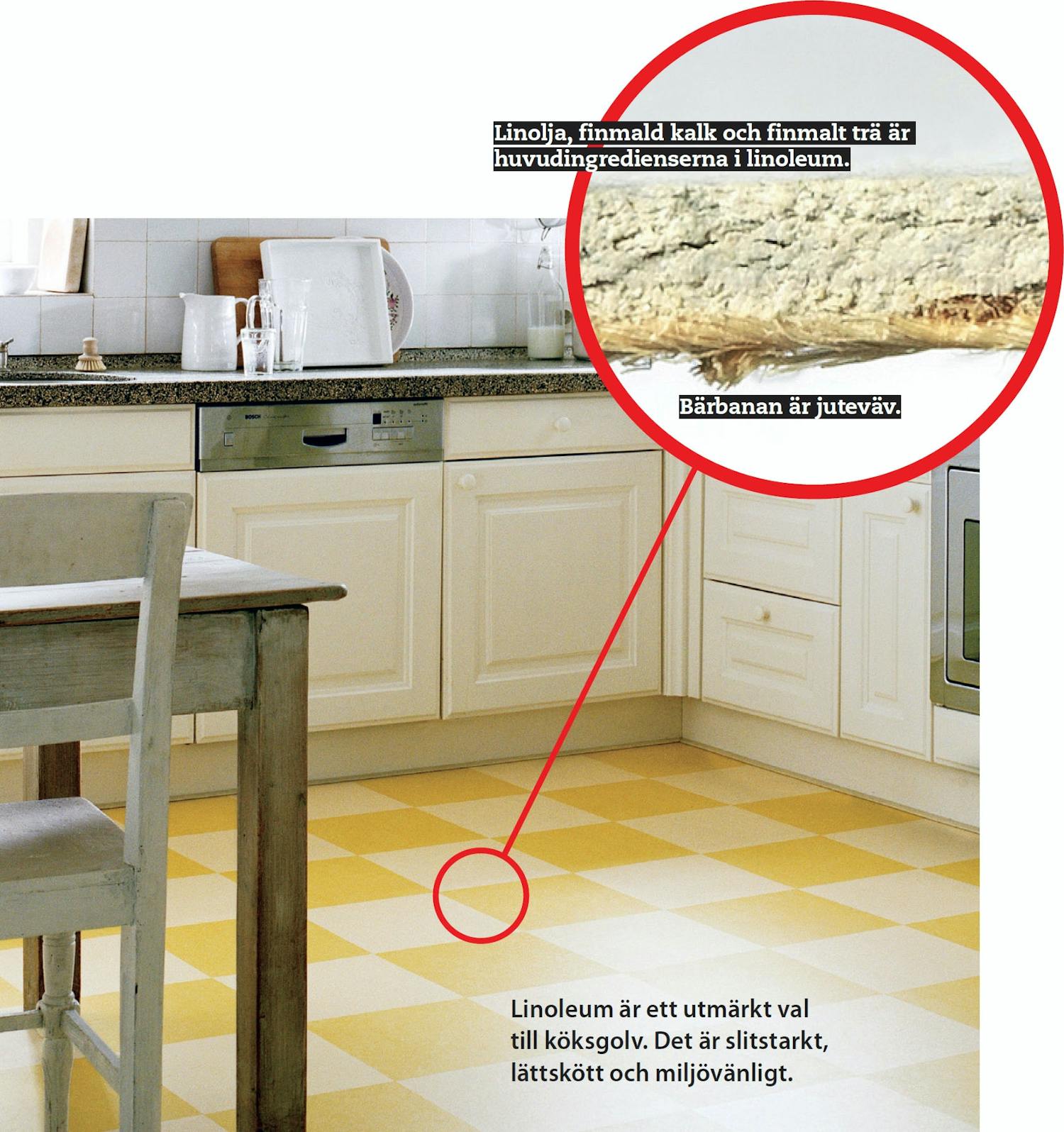 Linoleum är bra för inomhusklimatet, lättstädat och kan användas i alla rum. Priset ligger på 200-300 kr per kvadratmeter på rulle och som plattor.