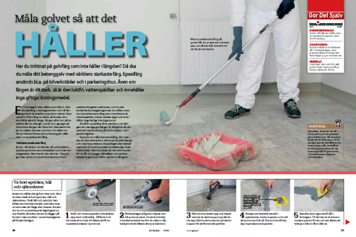 Den tvåkomponents epoxibaserade färgen fäster bra, men det förutsätter att underlaget är rent. Du måste därför tvätta golvet noga med t.ex. målartvätt. Skulle du ha spillt olja på golvet måste du avfetta fläckarna.