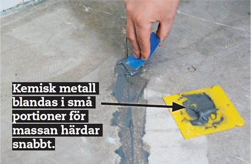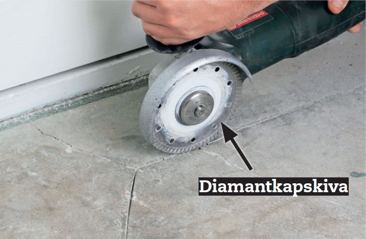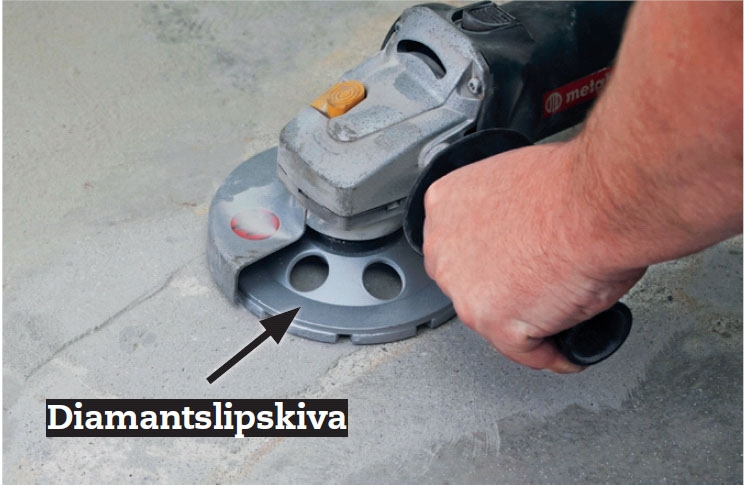 Små och tunna sprickor bör skäras upp med vinkelslip. Då får du bort löst material och det blir lättare att få ner reparationsmassan i sprickorna.