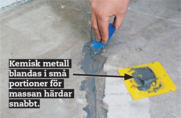 Pressa ner kemisk metall i sprickorna med en spackel, och se till att sprickorna fylls väl. Dra bort överflödig lagningsmassa med spackeln.