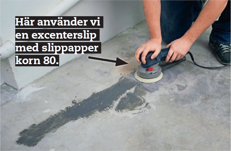 När reparationsmassan har torkat slipas området ner i nivå med golvet. Torktiden kan vara upp till en timme beroende på temperatur och lagertjocklek.