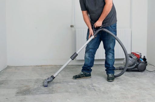 Dammsug hela golvet noga. Stoppa spackeln i bakfickan, så att du har den med dig och kan skrapa bort fläckar du har glömt.