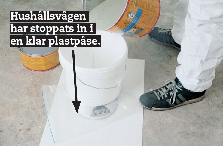 Sätt en ren och tom färgburk på vågen och nollställ vågen. Häll i önskad mängd av komponent A, som ska motsvara 7 delar. Här häller vi i 2,1 kg.