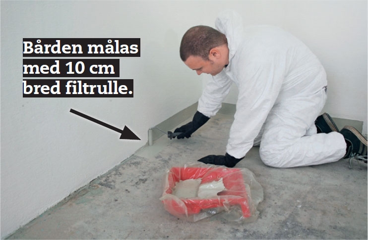 Måla inte mer av bården än att du hinner måla golvet innanför bården innan färgen på väggen torkar. Stryk ut färgen med en 25 cm rulle och rulla hela tiden åt samma håll.