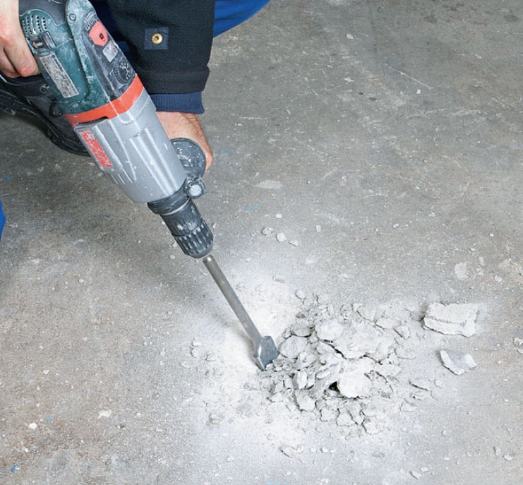 Börja med att hugga upp sprickor, porösa partier och skador. Använd mejsel och handslägga eller ännu hellre en bilningshammare. Dammsug sedan noga.