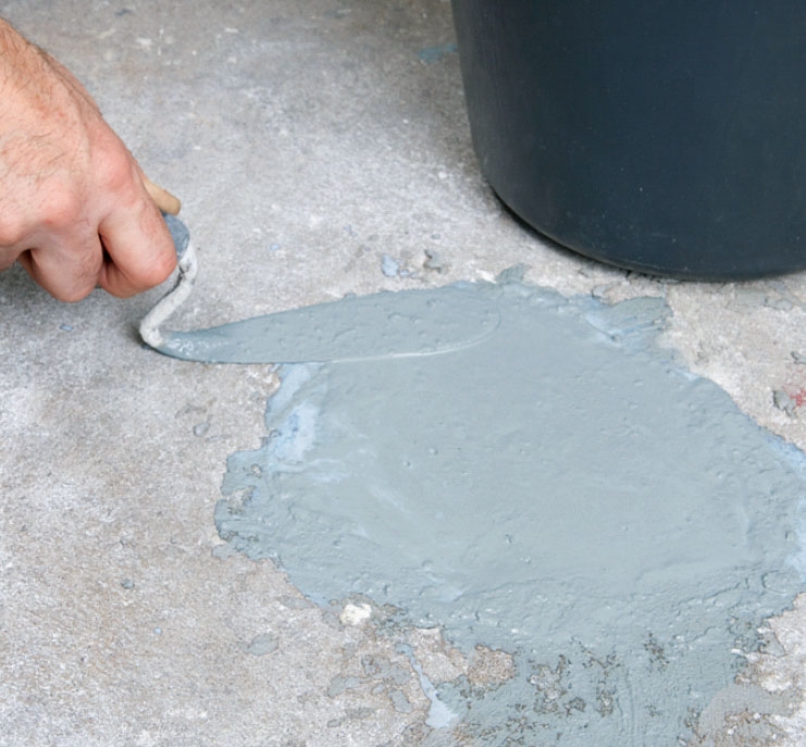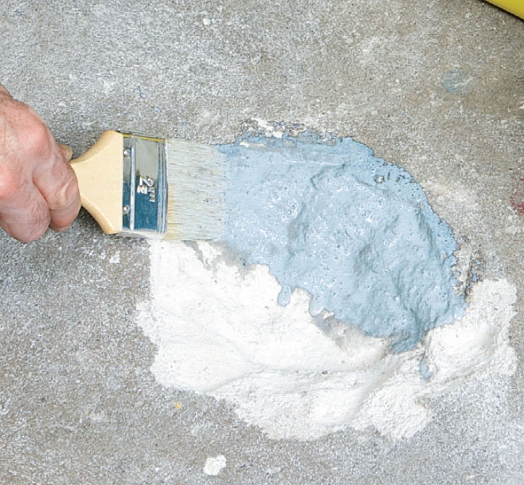 Gör en tunn blandning av betonglim, vatten och finbetong och pensla på blandningen noga. Se till att den fördelas över hela lagningen.