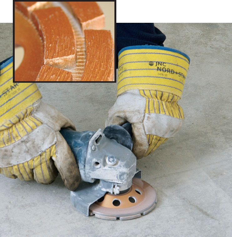 Slipningen dammar mycket så du ska sörja för ventilation. Tejpa igen dörrar till resten av huset, och använd handskar, hörselskydd och ansiktsmask. Efter slipning dammsugs golvet noga. Sprickor och lösa partier huggs upp och lagas med finbetong.