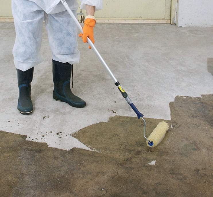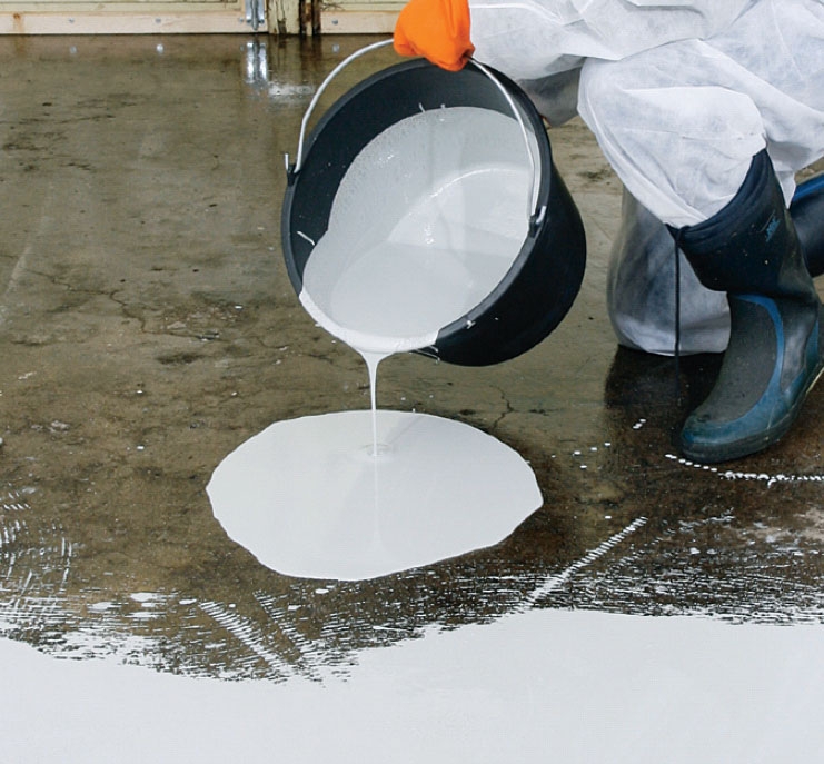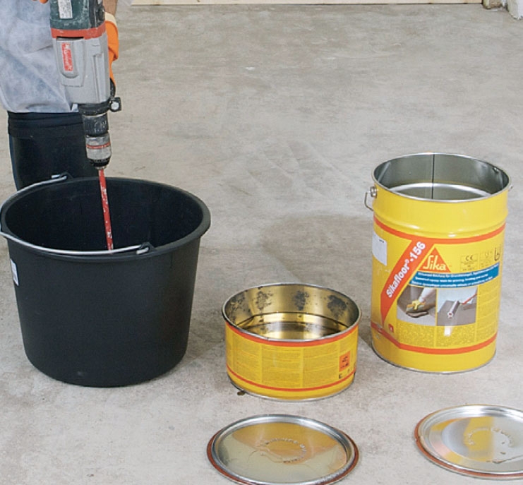 Innan du kan måla golvet, ska du grunda det. Här väljer vi en tvåkomponents epoxigrundfärg, som passar ihop med slutfärgen, nämligen Sikafloor-156 som är en färglös grundfärg.