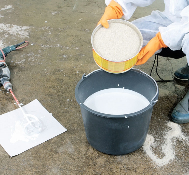 När grundfärgen har torkat i minst 12 timmar är det dags att lägga på den epoxibaserade slutfärgen. För att dryga ut färgen, göra den mer slitstark och minska halkrisken på golvet tillsätter vi kvartssand. Eftersom den sjunker till botten, måste färgen röras om för varje gång den ska hällas ut på golvet.