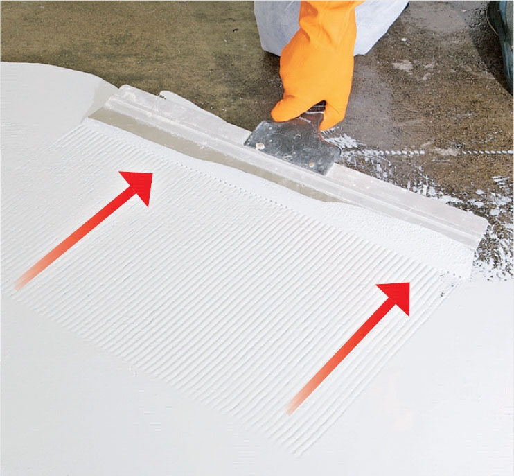 För att få ett lika tjockt färgskikt över hela golvet fördelar vi färgen med en 6 mm tandspackel som hålls i flack vinkel. Färgen i spåren efter tänderna flyter snabbt ihop och då blir färgskiktet cirka 2 mm tjockt över hela golvet.