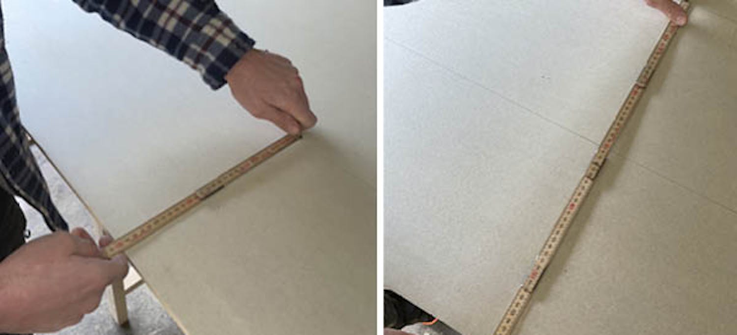 Markeringen av skruvraderna görs genom att hålla tumstocken på rätt mått vid spackelkanten, samtidigt som blyertspennan dras tillsammans med tumstockens ände.