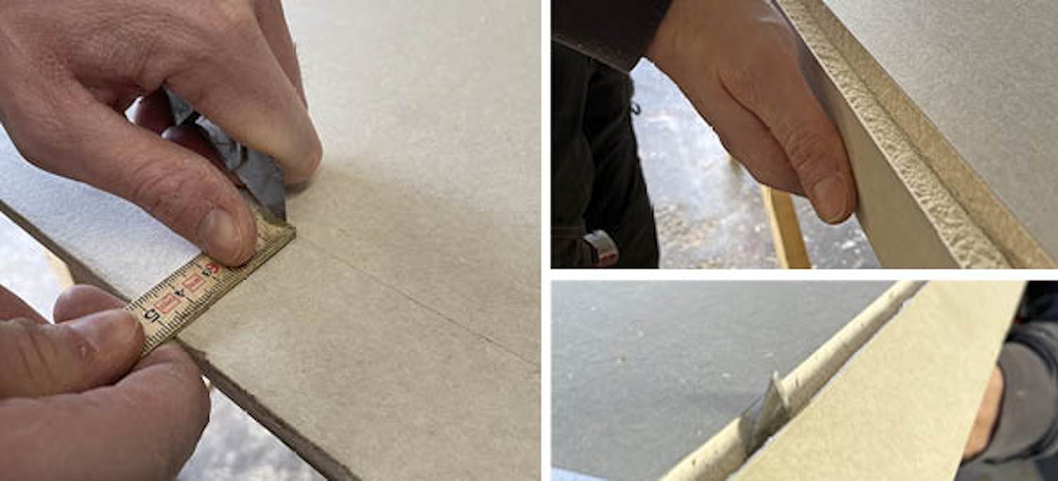 Om du skär den lite snett (i bakkant) så kan du vara säker på att skivan sluter helt tätt mot angränsande ytor när den ska monteras.