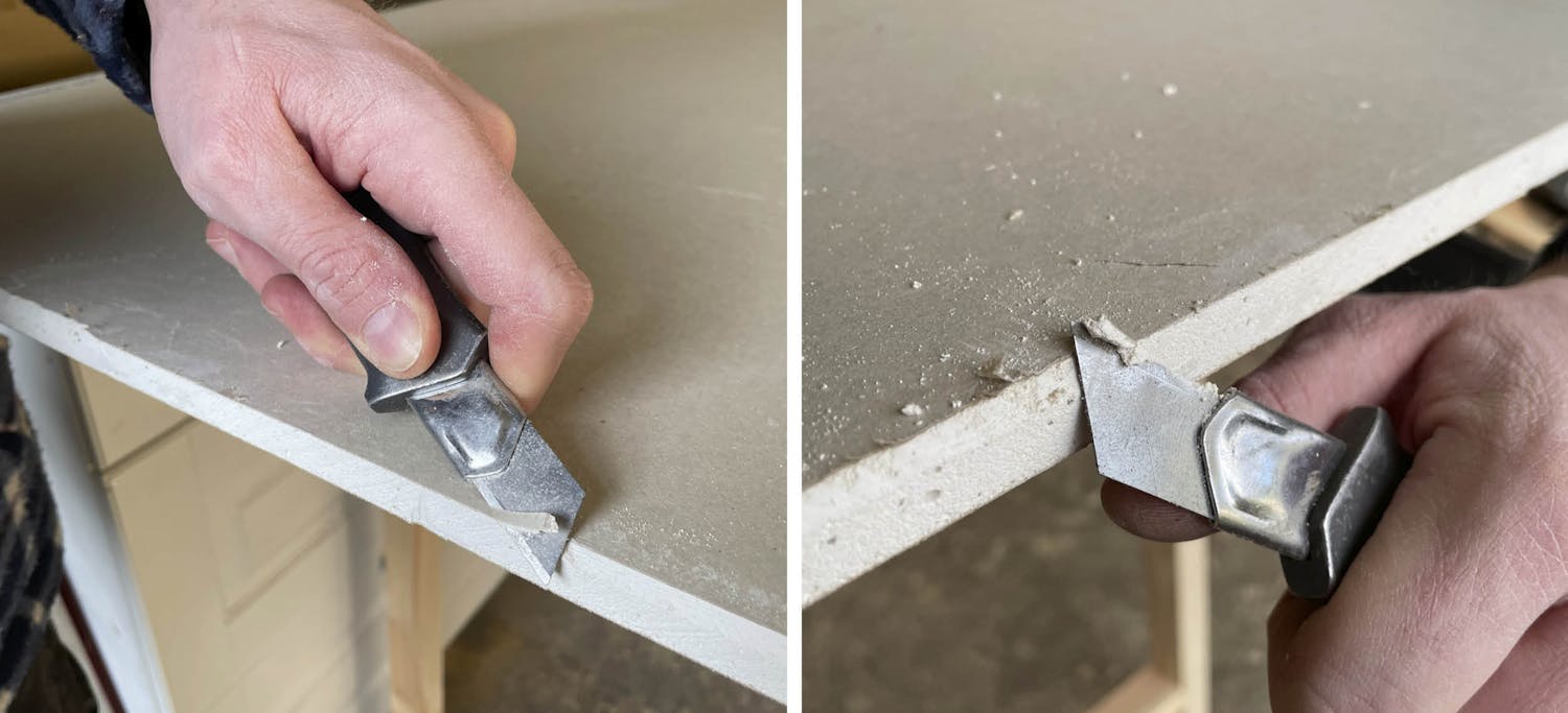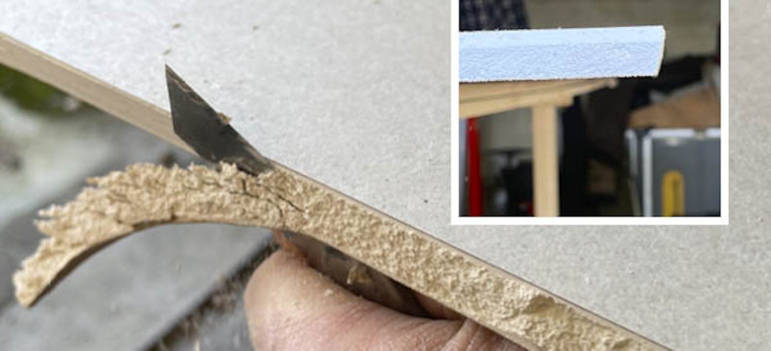 Även om snittet på skivan är helt rakt, så är den avbrutna skivkanten lite ojämn. Därför är det nödvändigt att du jämnar till kanten innan montering. Vi gör det med en helt vanlig hobbykniv.