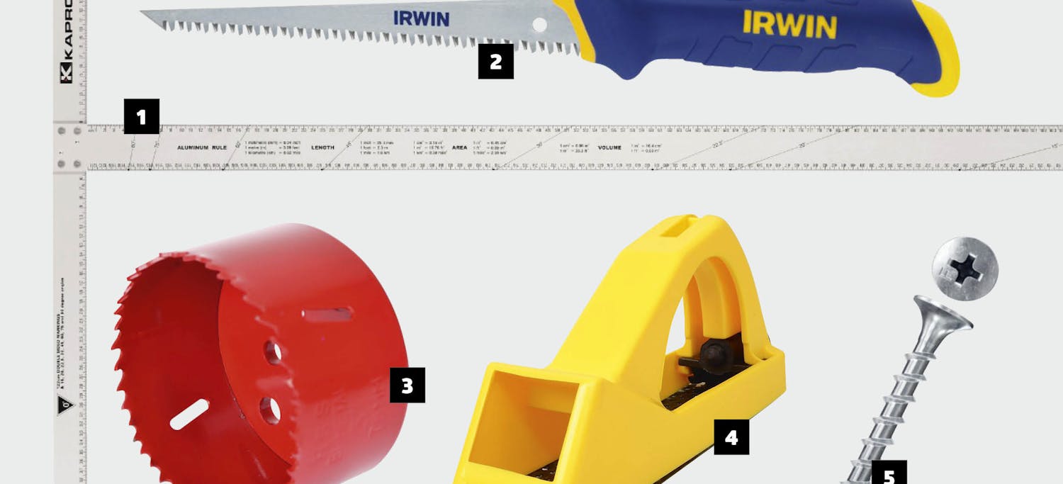2: Gipssåg. Den lilla spetsiga sågen är perfekt för att göra små justeringar i gipsskivan med.