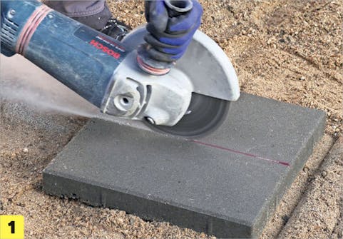 Kapa plattan med vinkelslipen. Börja med att skära ett spår i hela plattans bredd innan du långsamt låter kapskivan arbeta sig genom plattan. Ett mjukt underlag som grus eller gräsmattan passar bra.