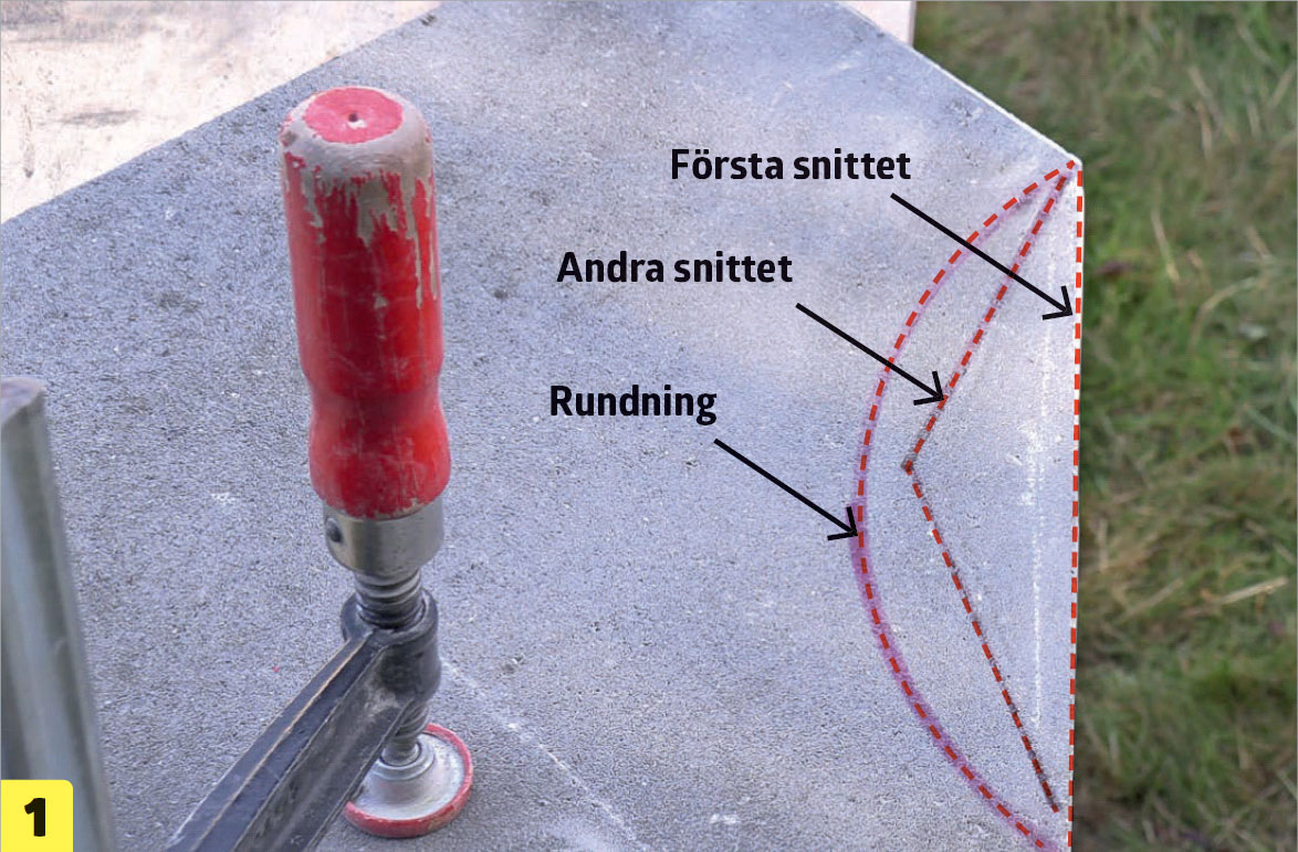 Till det rundade snittet måste vinkelslipen kunna komma in från sidan. Plattan måste därför spännas fast ordentligt på ett bord, en hyvelbänk eller liknande.