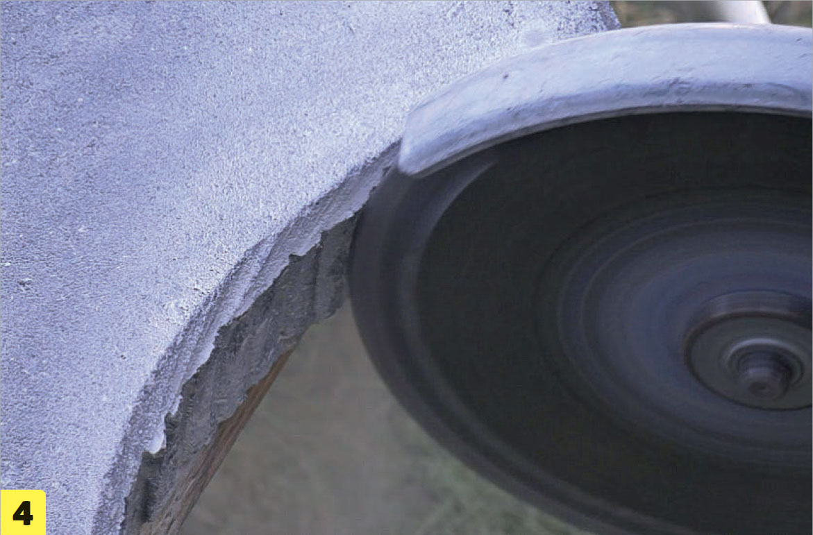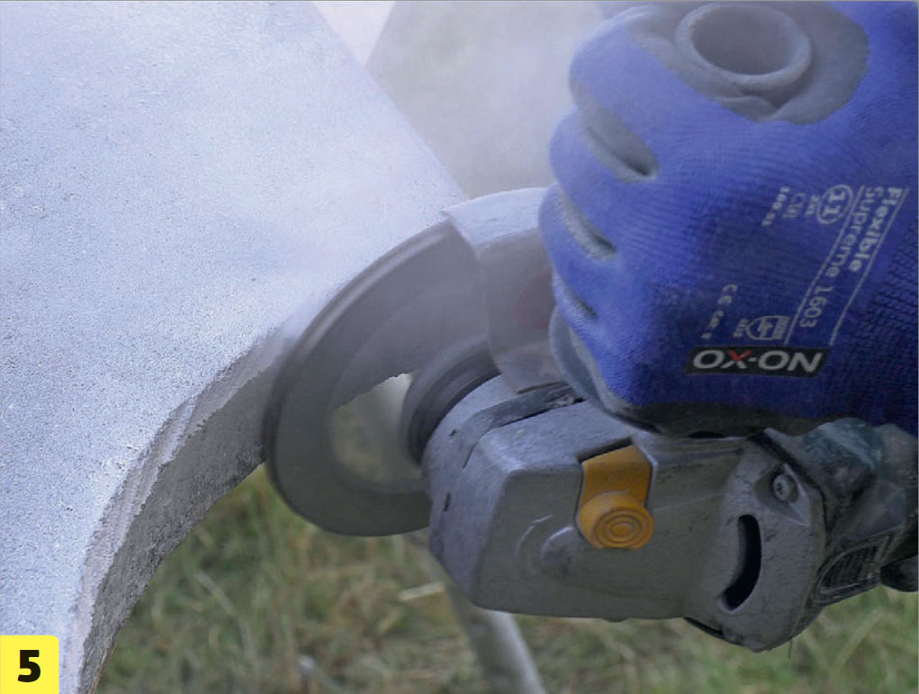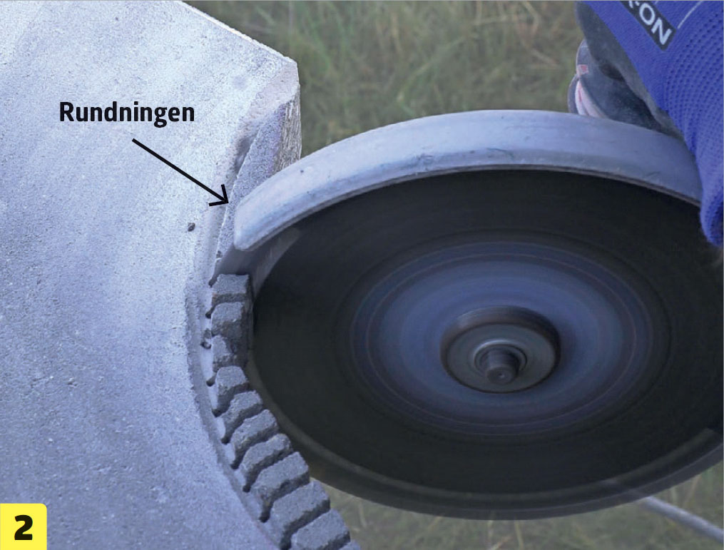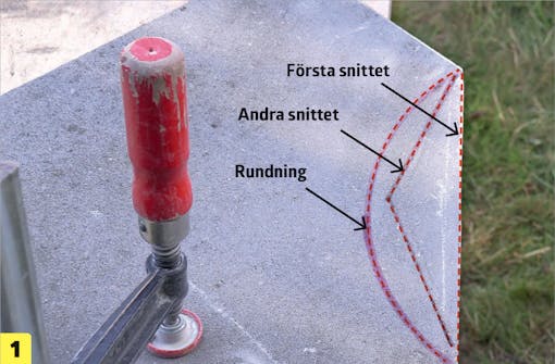 Rensa rundningen grovt med vinkelslipen. Du ska fortsätta använda diamantkapskivan här. Akta så att du inte råkar skära in i plattan eller gör spår på plattans ovansida.