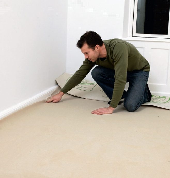 Pressa fast mattan ordentligt längs alla väggar, t.ex. med baksidan av en sax. Här sitter socklarna kvar och endast sockellisterna har tagits bort.