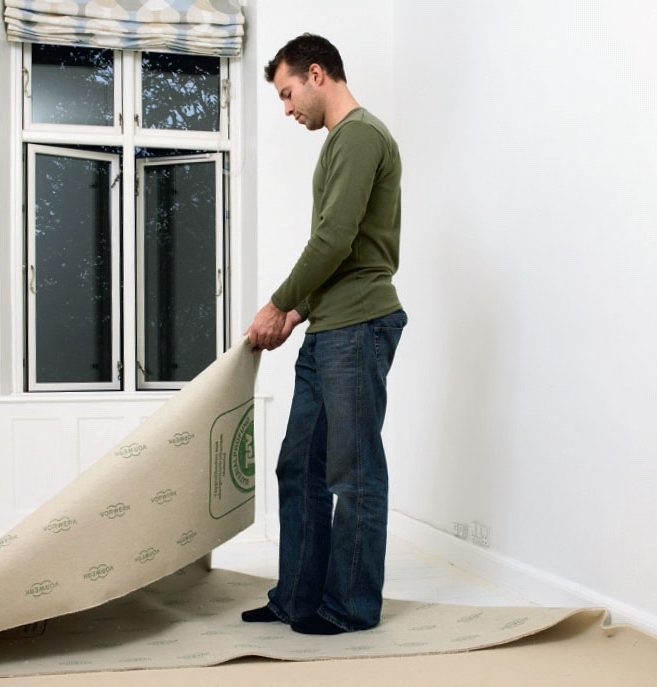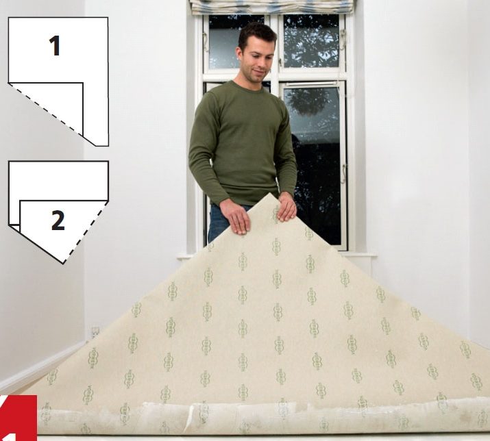 Börja på mitten och rulla ut mattan mot hörnen. Pressa och stryk hela tiden i riktning mot hörnen så att mattan slätas ut ordentligt Pressa ut mot sidorna.