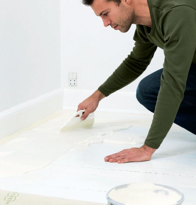 Fördela limmet med limspackel tills ytan har täckts i ett jämntjockt skikt. Överflödigt lim öses upp i en burk.