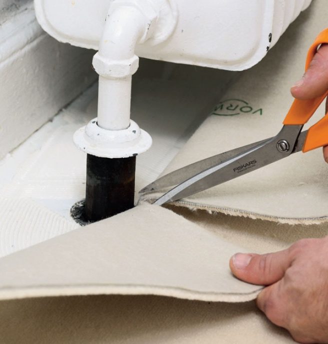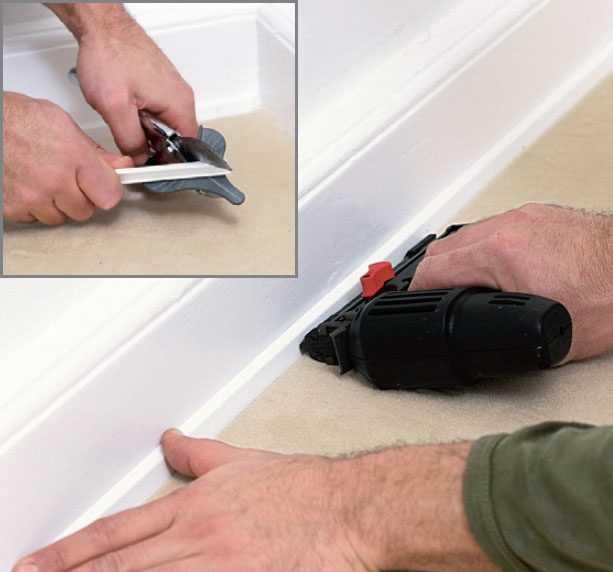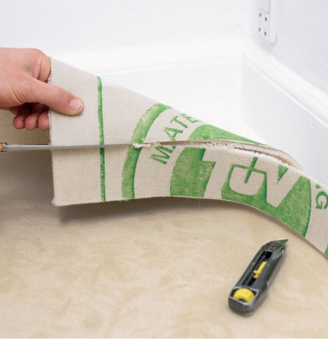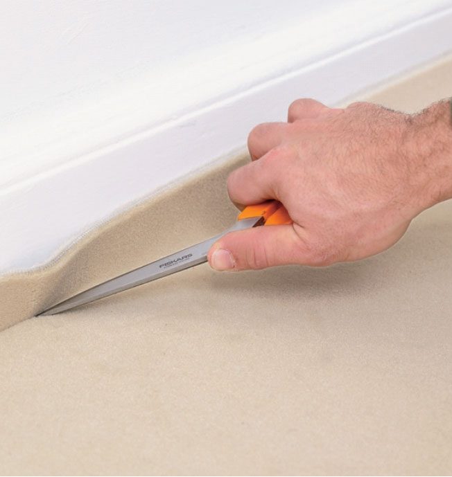 Skär rent längs kanterna med mattkniv eller hobbykniv. Vinkla kniven cirka 45 grader och pressa ner mattan medan du skär. Då blir det inga märken på väggen eller socklarna.