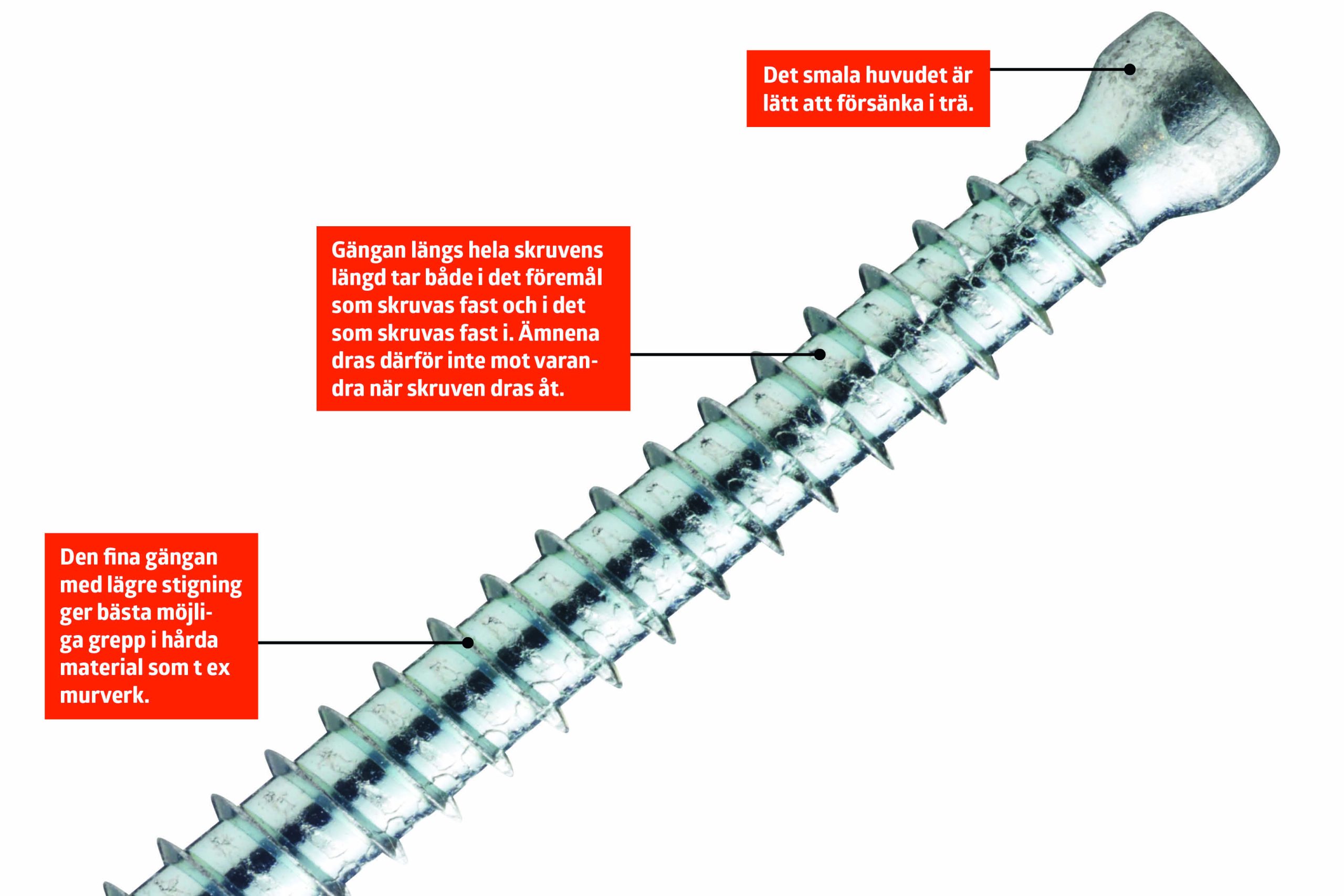 Skruven finns i både en version med huvud och en utan huvud. Vi föredrar den utan huvud. Det beror på att gängan griper tag i både föremålet som skruvas fast och föremålet som du skruvar fast den i. Därför behövs inget stort huvud för att hålla allt på plats. Det är också lättare att försänka skruven utan huvud.