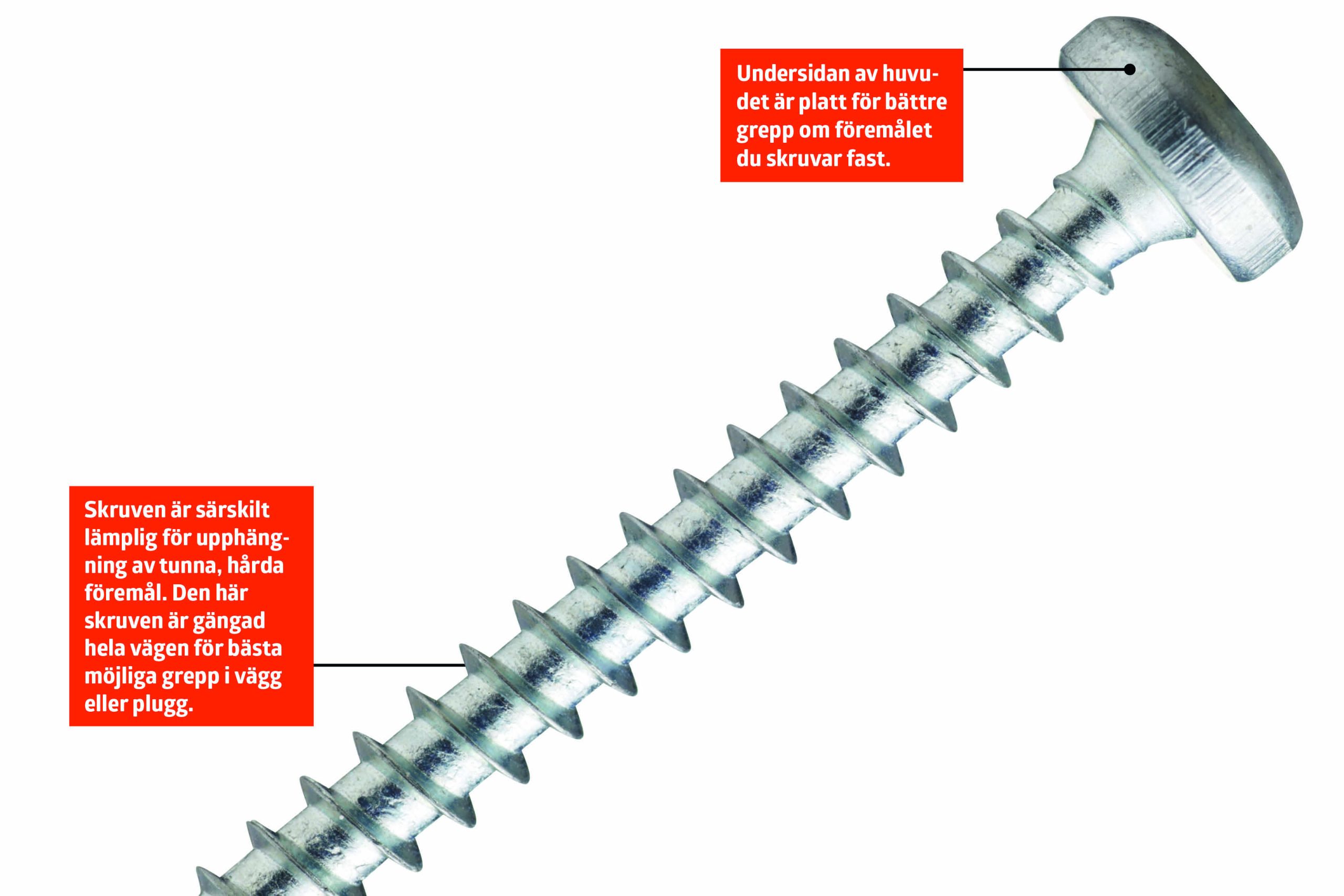 Skruven kan monteras direkt i trä eller i en plugg och en ankarskruv på 4,8 x 40 mm passar både de flesta beslag, upphängningar och vanliga plugg på 6 x 30 mm.