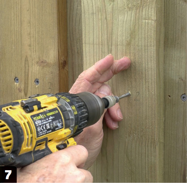 Det ser snyggt ut när skruvarna sitter på en lång, rak rad, men mallen ser också till att skruvarna sitter rätt. På lockpanel, som vi gör här, är det t ex viktigt att skruvarna från det yttersta lagret, lockbrädan, inte går genom den som sitter innanför, bottenbrädan. Det ser mallen till att de inte gör.