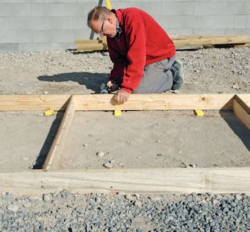 Gjutformen är en viktig del av arbetet. Den ska ju forma betongen till det format och den tjocklek vi önskar. Formen snickras av reglar eller brädor, och till skillnad från andra formar ska vår inte ha någon botten. Den ersätts i stället av det underlag som vi har vibrerat och gjort klart.