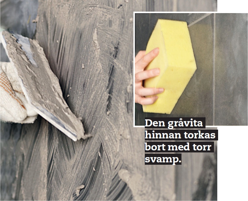 De stora plattorna är kalibrerade. Det innebär att de har sågats med helt raka kanter på alla fyra sidor sedan bränts. Här är varje platta 60 x 60 cm och därför går det undan att klä en vägg.
