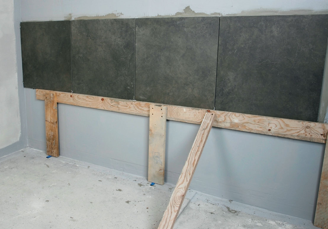 För att få de stora plattorna att sitta rakt och plant börjar du med den näst nedersta raden. Leta reda på golvets lägsta punkt och mät sedan en plattrad upp inklusive en fog-bredd och sätt ett märke. Dra ett vågrätt streck hela vägen runt. Det är baslinjen för den näst nedersta raden. Håll en hyvlad bräda längs strecket och fixera den med stödben och snedsträvor.