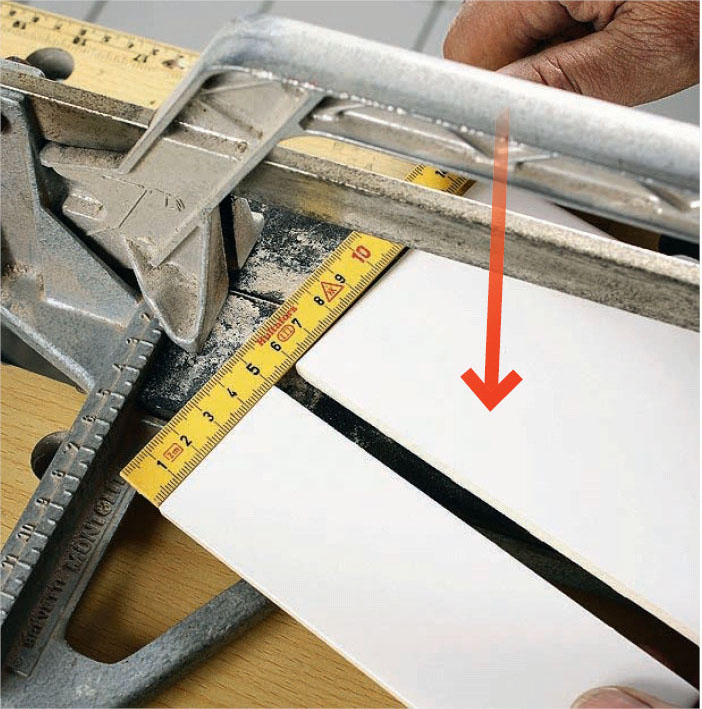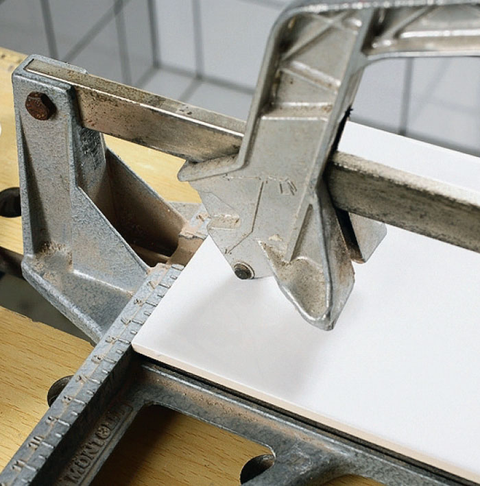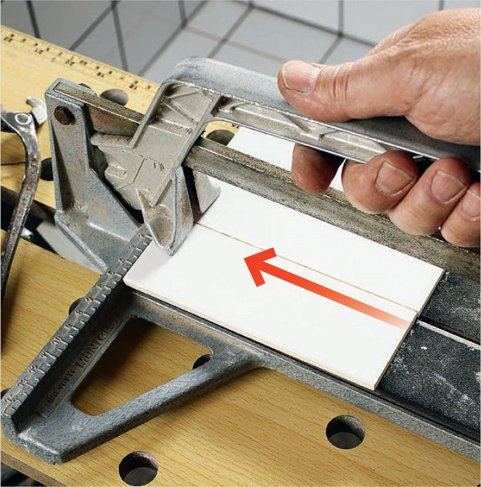 Kakelskärarens hjul pressas ner mot plattan i den “fria” änden och förs framåt i en lugn rörelse. Skärhjulet ska bara bryta den hårda glasyren.