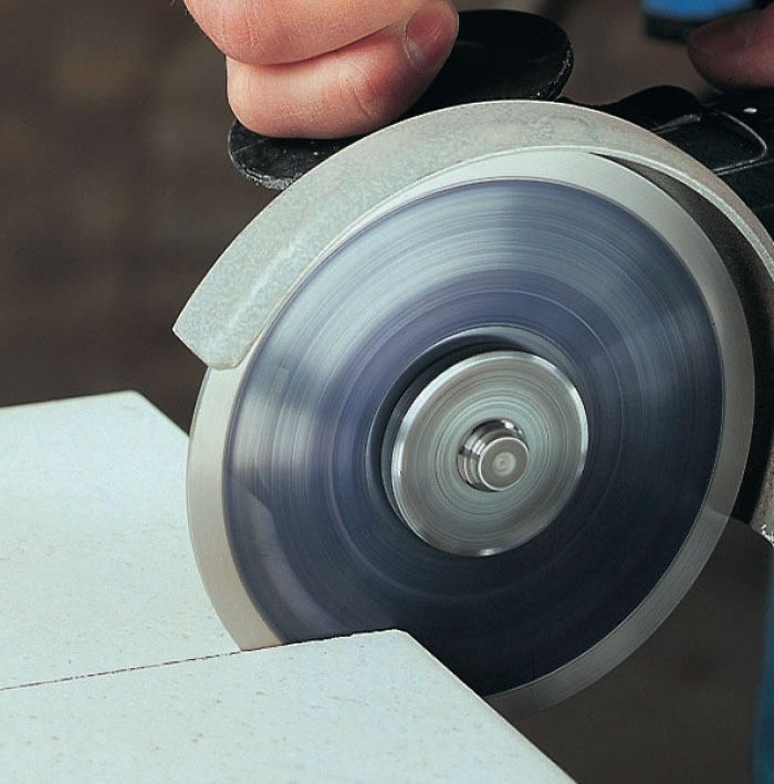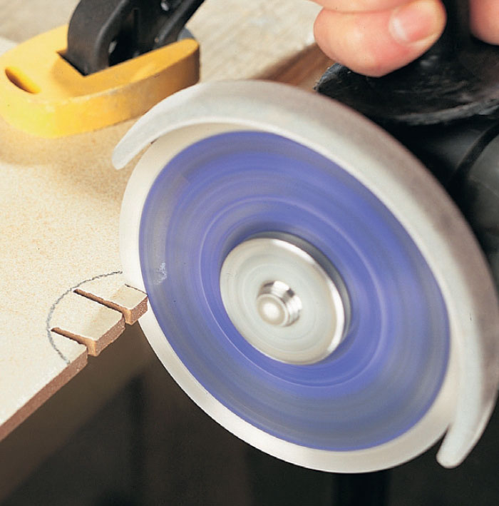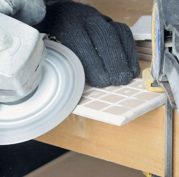 Plattor som möts i ett utvändigt hörn ska kapas snett på baksidan, så att fogen inte blir för bred. Det kan göras med en slipskiva på vinkelslipen.