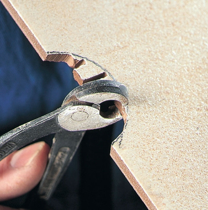 Med kakeltången bits småbitar av klinkern. Tar man för stora bitar riskerar man att plattan knäcks. Kom ihåg skyddsglasögon.