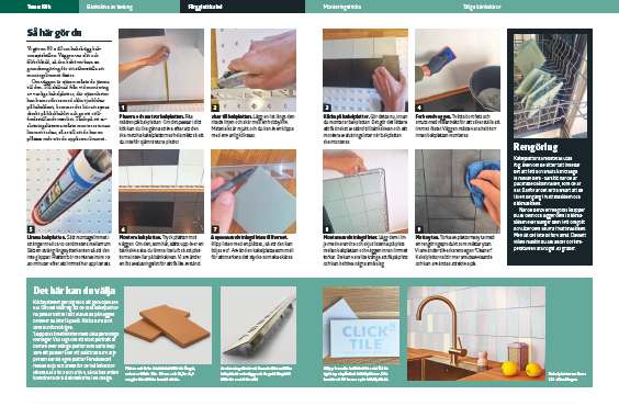Om väggen är ojämn måste du jämna till den. Till skillnad från vid montering av vanliga kakelplattor, där ojämnheter kan kamoufleras med olika tjocklekar på kakelfixet, kommer det här att synas direkt på klickkaklet och ge ett otillfredsställande resultat. Tänk på att avslutningslisterna måste monteras innan limmet torkar, så se till att du har en plåtsax redo när du applicerar limmet.