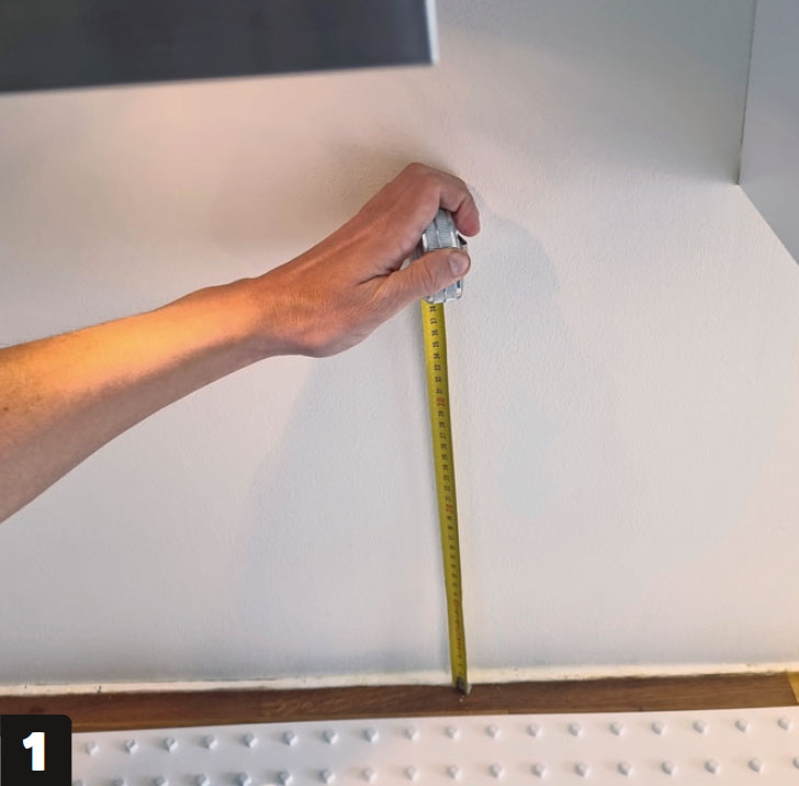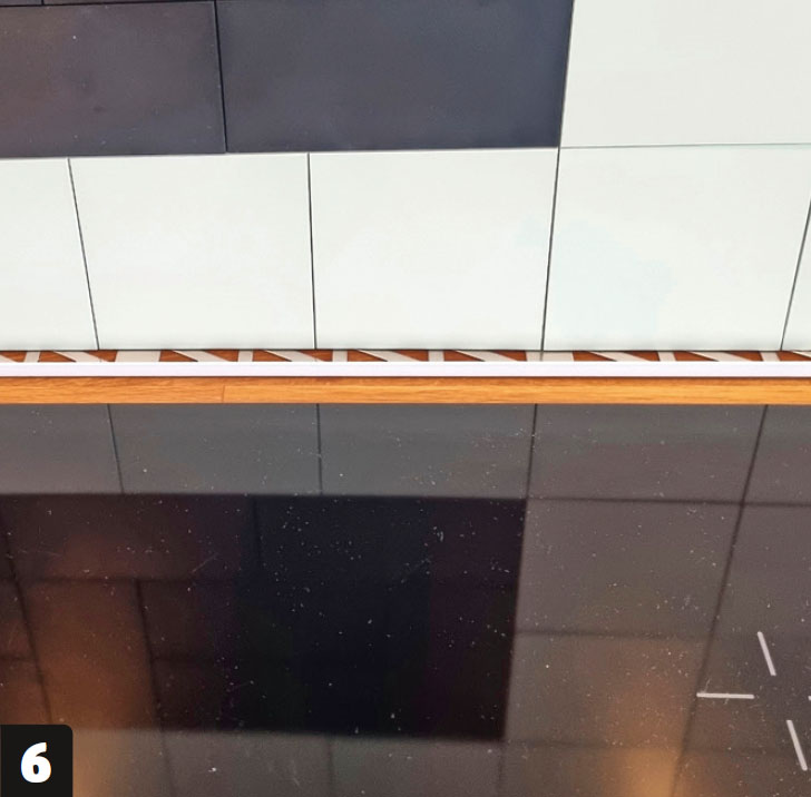 Montera bakplattan. Tryck plattan mot väggen. Om den, som här, sätts upp över en bänkskiva ska du lämna lite luft så att plattorna inte vilar på bänkskivan. Vi använder en lös avslutningslist för att få lite avstånd.