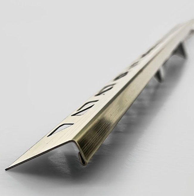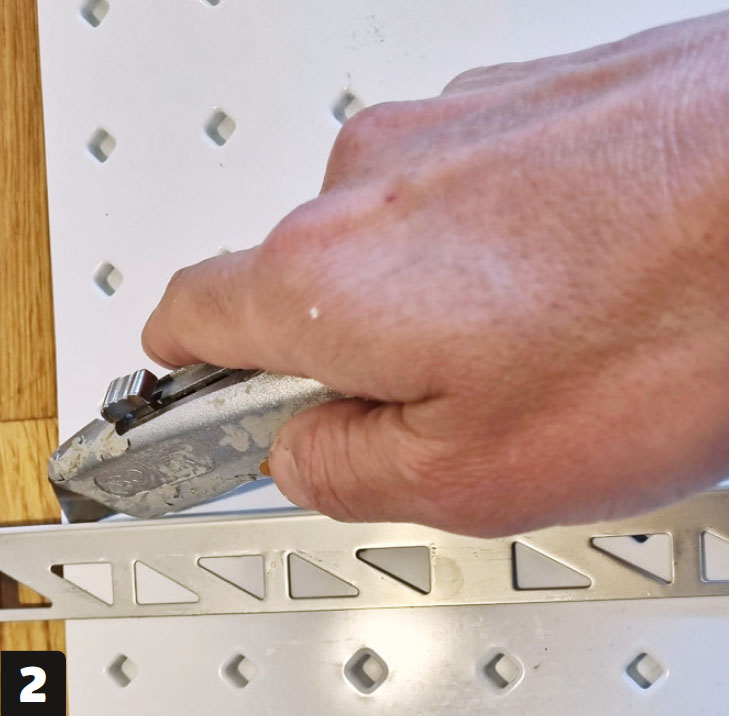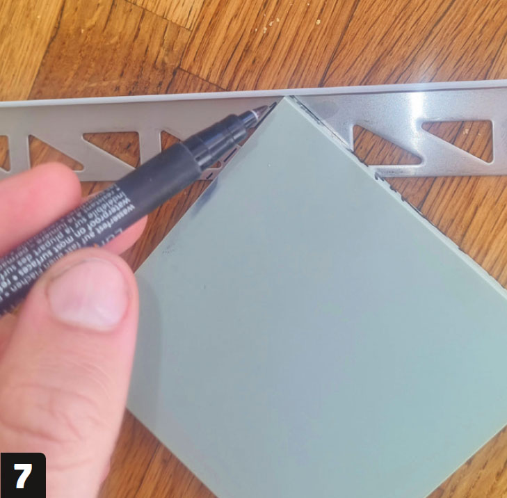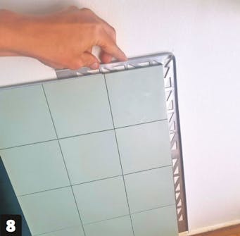 Anpassa avslutningslisten till hörnet. Klipp listen med en plåtsax, så att den kan böjas 90°. Använd en kakelplatta som mall för att markera det stycke som ska skäras.