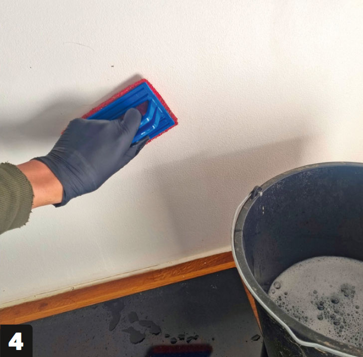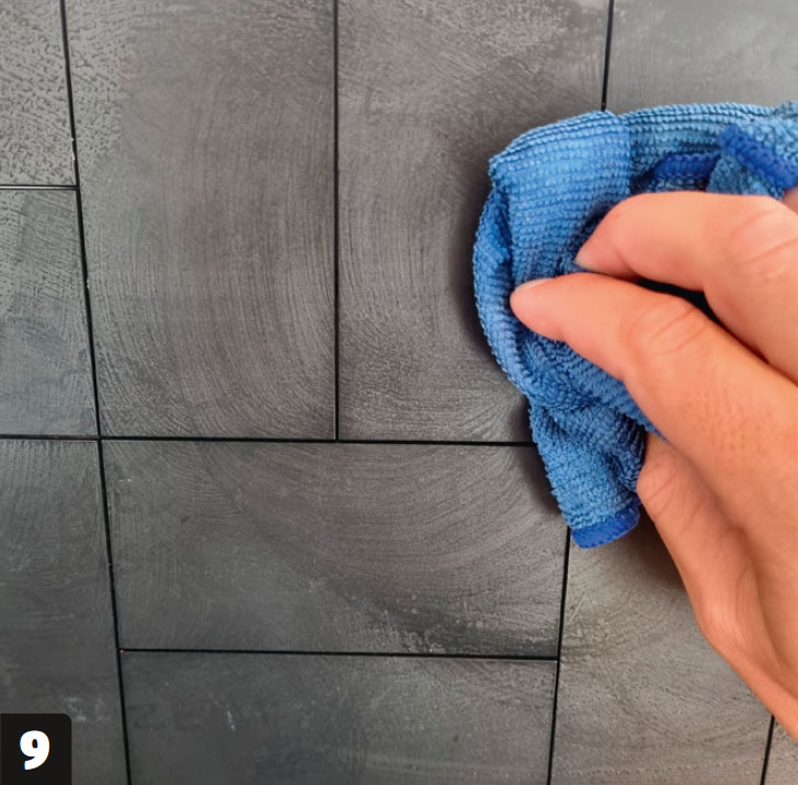 Vi gör en 80 x 40 cm kakelvägg bakom spishällen. Väggen var slät och filtbeklädd, så den behöver bara en grundrengöring för att säkerställa att montagelimmet fäster.
