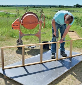 Blanda betongen i maskin (som du hyr). För att betongen ska bli stark ska du välja fiberbetong eller tillsätta fiber (t.ex. Sika Cim).