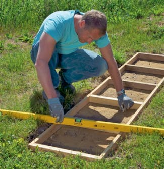 Lägg formen på plats och kolla att den ligger stadigt och vågrätt. Men först tar du bort matjorden och lägger 10 cm packat grus.