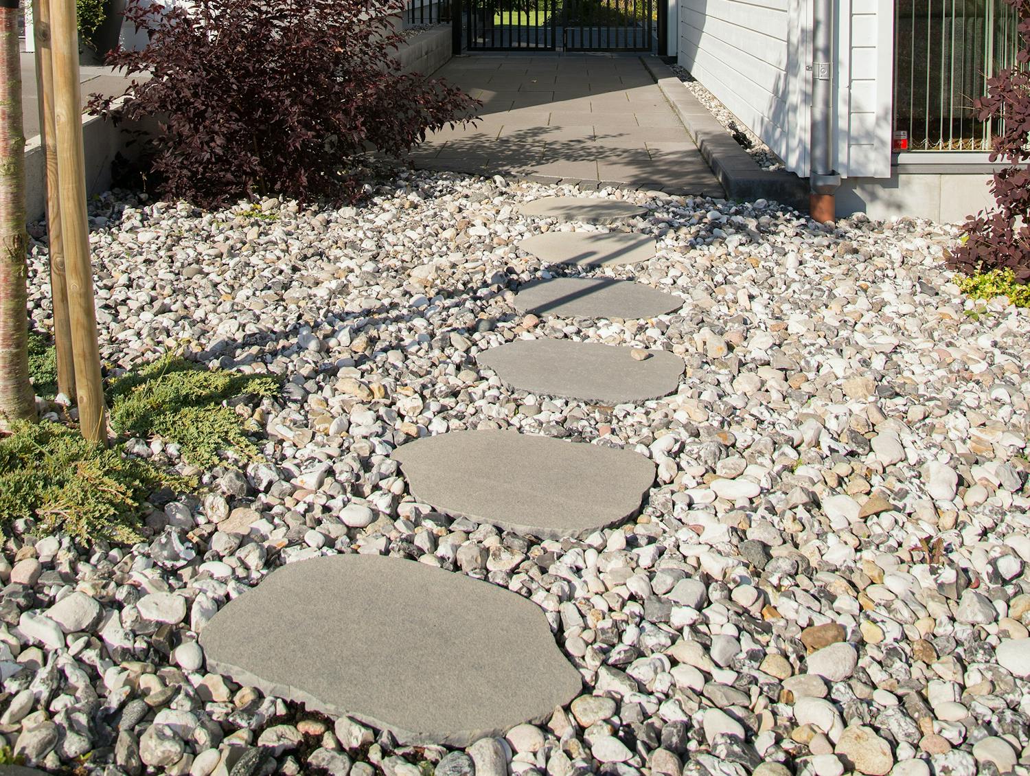 I just trädgården, som bilden under visar, är det snyggt att använda oregelbunden skiffer som stegsten. Du kan också lägga stegstenar i en grusgång eller direkt i rabatten. Fördelen då blir att du kan dra loss ogräs och luckra upp jord utan att behöva stå direkt i rabatten.