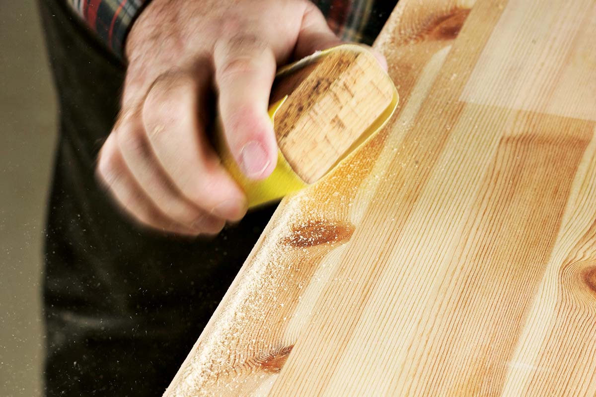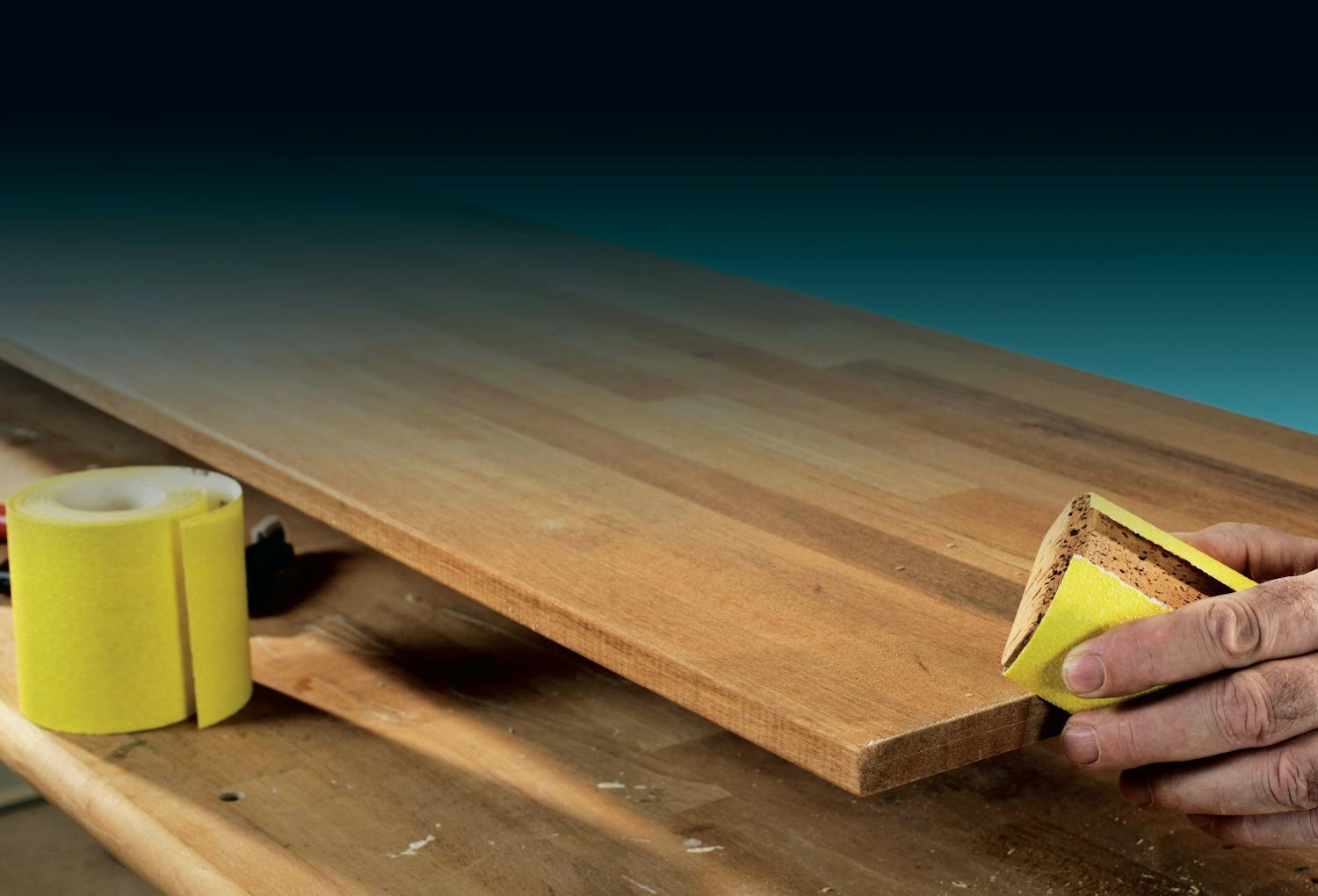 Använd alltid slipkloss. Vid slipning av kanter frigörs det ofta långa stickor. De kan lätt gå igenom slippapperet och in i handen om du tar i.