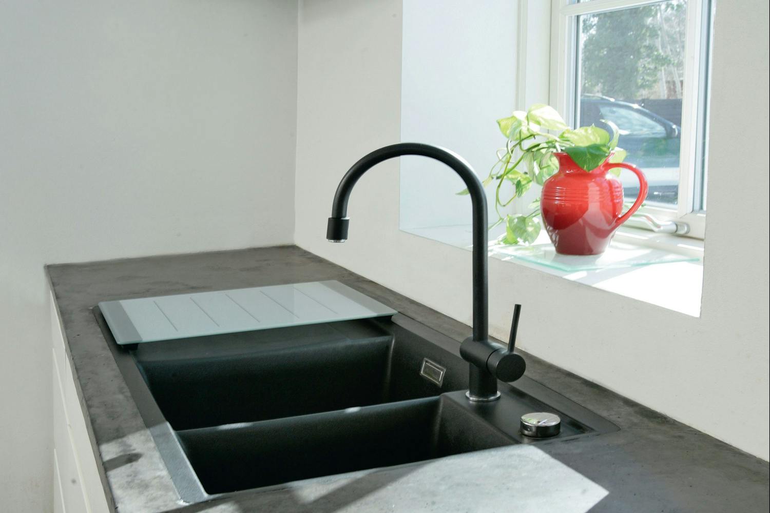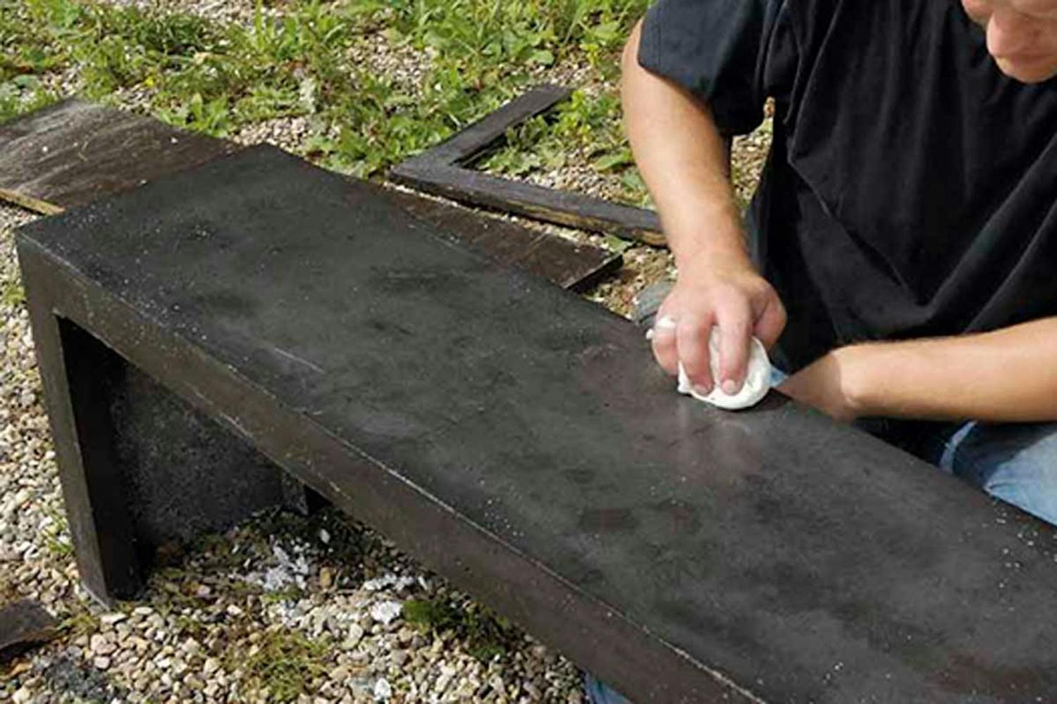 Betongen hälls direkt i en gjutform av formplywood. Där du inte vill ha betong placerar du frigolit. Här gjuts frigoliten in i betongbänkens ben och när betongen har härdat bränns frigoliten bort.