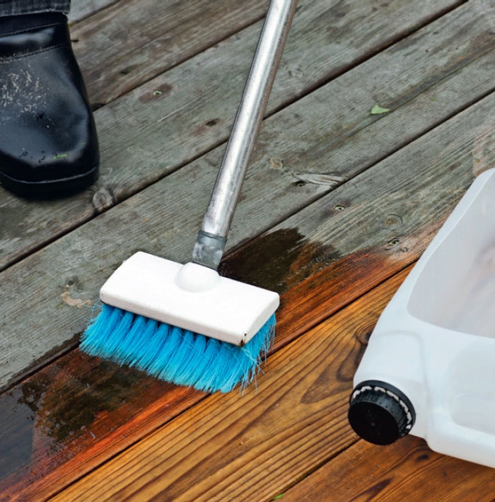 När rengöringsmedlet har verkat, avlägsnas det med vatten och en ren kvast eller - ännu bättre - en högtryckstvätt med en terrasstvätt monterad. Det skonar träets yta.