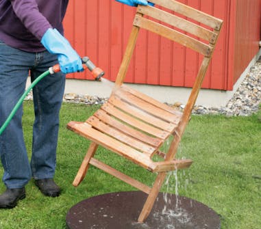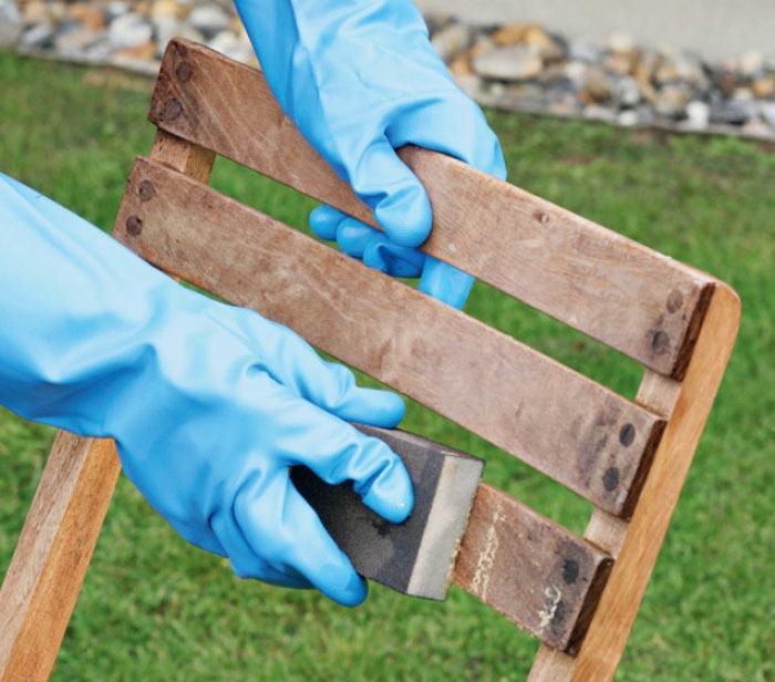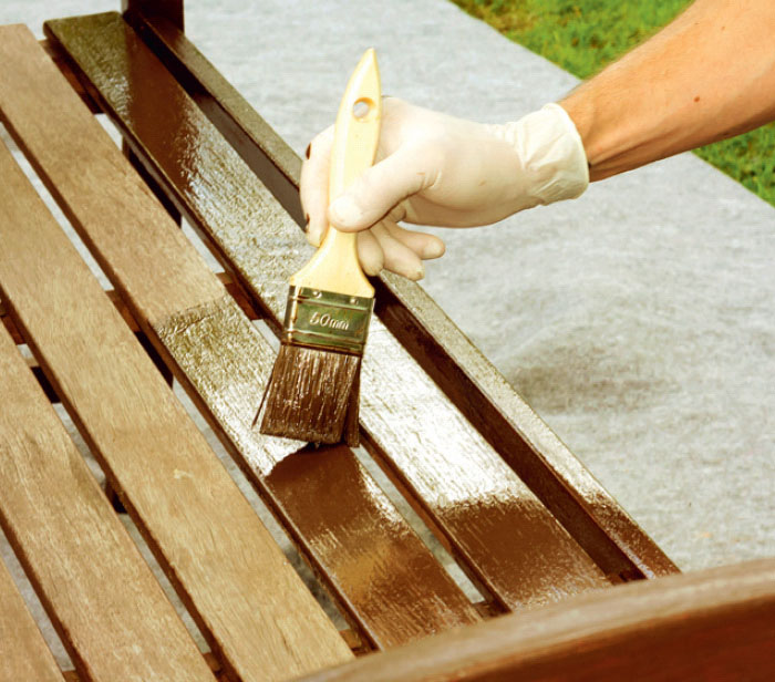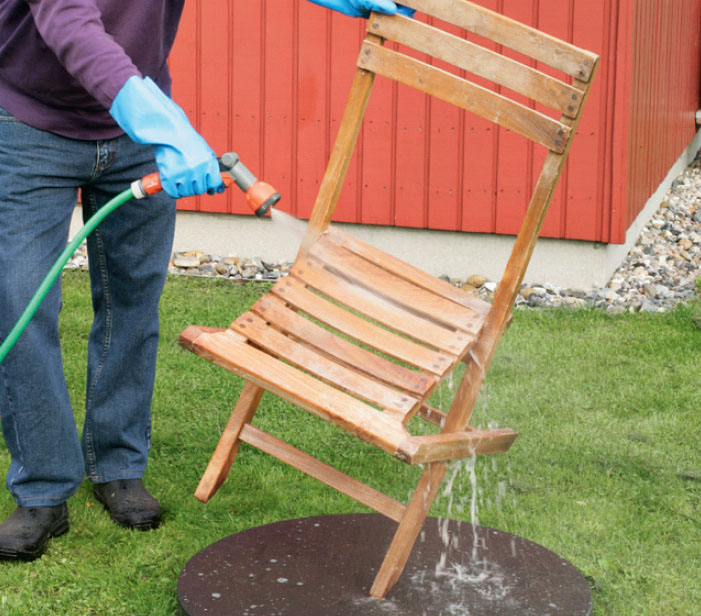 Trädgårdsmöbler ska först rengöras noggrant med trärent, som finns på byggmarknader och i färghandeln. Träet kan slipas med en fin slipkloss, om det är väldigt slitet.